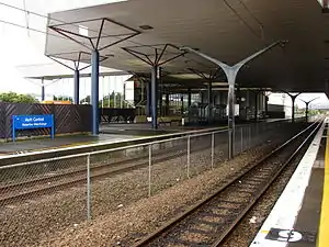 Waterloo railway station (previously known as Waterloo Interchange or Hutt Central) is a dual-platform suburban railway station located in Lower Hutt, New Zealand, and serving immediately the suburbs of Waterloo, Lower Hutt Central and Woburn. The station stands on the Hutt Valley section of the Wairarapa Line, 15.5 km (9.6 mi) north of Wellington. Trains stopping at Waterloo run to Wellington, Taita, Upper Hutt and Masterton, as well as to points in between. Waterloo serves as a major bus-rail interchange, connecting buses to and from central Lower Hutt, Naenae and Wainuiomata with trains to and from Wellington.
