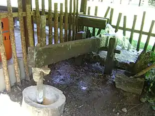 The waterwheel was found in China from 30 AD onwards, when it was used to power trip hammers,[41] the bellows in smelting iron,[42][43] and in one case, to mechanically rotate an armillary sphere for astronomical observation (see Zhang Heng).[44][45] Although the British chemist and sinologist Joseph Needham speculates that the water-powered millstone could have existed in Han China by the 1st century AD, there is no sufficient literary evidence for it until the 5th century AD.[46] In 488 AD, the mathematician and engineer Zu Chongzhi had a watermill erected which was inspected by Emperor Wu of Southern Qi (r. 482–493 AD).[47] The engineer Yang Su of the Sui Dynasty (581–618 AD) was said to operate hundreds of them by the beginning of the 6th century.[47] A source written in 612 AD mentions Buddhist monks arguing over the revenues gained from watermills.[48] The Tang Dynasty (618–907 AD) 'Ordinances of the Department of Waterways' written in 737 AD stated that watermills should not interrupt riverine transport and in some cases were restricted to use in certain seasons of the year.[47] From other Tang-era sources of the 8th century, it is known that these ordinances were taken very seriously, as the government demolished many watermills owned by great families, merchants, and Buddhist abbeys that failed to acknowledge ordinances or meet government regulations.[47] A eunuch serving Emperor Xuanzong of Tang (r. 712–756 AD) owned a watermill by 748 AD which employed five waterwheels that ground 300 bushels of wheat a day.[47] By 610 or 670 AD, the watermill was introduced to Japan via Korean Peninsula.[49] It also became known in Tibet by at least 641 AD.[49]