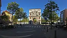 The Waterpoort was erected in 1624,[3][4][2] and originally served as a water gate on the Scheldt river, functioning as a passage to the river from the fortified wall that protected the city of Antwerp,[3] through which boats could get to the Vlasmarkt from the Scheldt side.[4] Inscriptions on both sides of the gate indicate this early function, as well as its role as an honorary arch to King Philip IV of Spain.[2][4] The gate's design has been attributed to Peter Paul Rubens, although, as opposed to the identity of the sculptors (Huibrecht van den Eynde and Johannes van Mildert), there is no hard evidence of Rubens' involvement.[4][2]