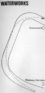 ![]() The two closely connected bends at Waterworks with their differing radii, showing the correct, optimal motorcycle racing-line through the section | |