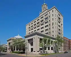 The company moved to Winona in 1885[4] and added a number of products to its lineup. Baking materials including pepper and vanilla extract were added in 1895 along with cinnamon, ginger, cloves, peppermint extract and lemon extract. Between 1889 and 1914, Watkins constructed six manufacturing buildings behind the Winona Administration Building. J.R. Watkins died in 1911. In 1914, a prominent ten-story building completed the look of the Administration Building. Maher's Administration Building included a 70-foot high rotunda dome coated in 24-carat gold leaf, a blue Bedford stone façade, 224 stained glass skylights and three custom-made Tiffany stained glass windows.