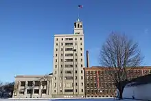 The seven-building Watkins headquarters in Winona is on the National Register of Historic Places as the J.R. Watkins Medical Company Complex. It was listed in 2004 for having national significance in the themes of architecture, commerce, and industry.[5] It was nominated for being the longtime headquarters of the nation's largest direct sales company in the early 20th century, and for the Prairie School design of its 1911 Administration Building by architect George W. Maher.[6] The front entrance includes a window designed by stained-glass artist Louis J. Millet depicting Sugar Loaf, a local landmark.