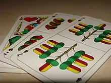 An unusual variant is Bohemian Watten (Böhmisch Watten, Kuddeln[7] or Hudln) or Bohemian Ramsen.[8] The number of players is not restricted because there are no teams and everyone plays alone. The biggest differences compared with standard Watten are Farbzwang, the requirement to follow suit (i.e. even if you have a higher card with which you could head the trick, you may not play it, if you have cards in the leading suit) and Stichzwang, the obligation to head (i.e. if you have a higher card, you must play it). The trump suit and trump striker are not determined by announcements, but by revealing a card when dealing, which the dealer then takes. This card is revealed between dealing the two packets of three and two cards, respectively.