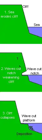 Wave-cut platforms form when destructive waves hit against the cliff face, causing an undercut between the high and low water marks, mainly as a result of abrasion, corrosion and hydraulic action, creating a wave-cut notch. This notch then enlarges into a cave. The waves undermine this portion until the roof of the cave cannot hold due to the pressure and freeze-thaw or biological weathering acting on it, and collapses, resulting in the cliff retreating landward. The base of the cave forms the wave-cut platform as attrition causes the collapsed material to be broken down into smaller pieces, while some cliff material may be washed into the sea. This may be deposited at the end of the platform, forming an off-shore beach.