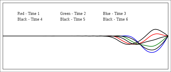 The direction of motion is reversed. The red, green and blue curves are the states at the times while the 3 black curves correspond to the states at with the wave starting to move back towards left.