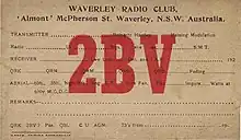 The Waverley Radio Club was founded on 27 January 1919 by a group of 17 radio experimenters and enthusiasts living in the Waverley area and allocated license number N249 by the navy department. In 1922, when the Postmaster-General's Department took over licensing, the club call letters (as they were then known) were changed to 2BV and in 1929 national prefixes were adopted so becoming the call sign VK2BV.[2]
