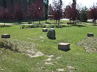 The memorial garden has stones laid out in the shape of a baseball diamond. The bases and home plate are represented by cubic stones with inscriptions. A large, irregularly shaped rock located in the centre represents the pitcher's mound with a plaque that reads: