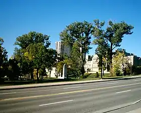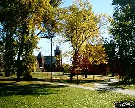 At the westernmost end of Waverley Park is the former Port Arthur Collegiate Institute, which was the oldest high school west of Toronto, Ontario. The large castle-like edifice was constructed in 1909-10 of Simpson Island sandstone, and incorporated medieval and Flemish architectural features. Being located on a hill, it has a very imposing nature when viewed from the park below. Its site was chosen by Montreal landscape architect Frederick Todd, and its architects were Young and Simpson of Toronto.[2]