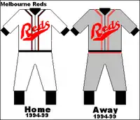 Melbourne Home – white with red trim top with "Reds" across the front, navy blue undershirt, white pants with red strip down the leg, white socks with red t-bars. Away – same as home but with grey where white is.