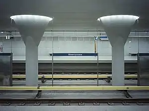 Metro Wawrzyszew, located at the corner of Kasprowicza and Lindego Street, became the 20th working station on Line M1 of the Warsaw Metro when it opened on 25 October 2008 as part of the extension from Słodowiec to Młociny.[1] It was designed by Polish architect Andrzej M. Chołdzyński.[2]