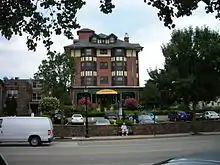 Wayne Hotel, formerly known as The Waynewood, is a historic hotel located at Wayne, Delaware County, Pennsylvania. It was built in 1906, and is a five-story, Tudor Revival building, with a two-story rear extension. It is built of brick and stucco with false Half Timbering. It features a one-story, wraparound porch with a semi-circular dining projection and two projecting bay windows extending from the second to fourth floors.[2]