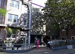 The Wayside Chapel was established in the Kings Cross area of Sydney in 1964.[5][6] Ted Noffs was the founder of the Wayside Chapel, which was at the time a Methodist ministry (Uniting Church from 1977).[7] At that time, it was only a single room with a dozen chairs in a block of flats at 29 Hughes Street, Potts Point. Within twelve months of his arrival, Noffs had transformed it into a chapel, coffee shop drop-in and community resource centre.[7] The expectations of the church hierarchy—that Noffs's experiment would fail and become obscure and irrelevant—were not realised.