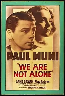 We Are Not Alone is a 1939 American drama film directed by Edmund Goulding and starring Paul Muni, Jane Bryan, and Flora Robson. The screenplay concerns a doctor who hires a woman as a nanny for his son. When his wife becomes jealous, tragedy consumes all involved. The film is based on the 1937 novel We Are Not Alone by James Hilton,[1] who adapted his novel with Milton Krims.