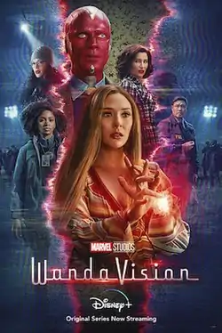 After the episode began streaming, Marvel released a poster featuring the characters and events depicted in "We Interrupt This Program".[46] Bleeding Cool's Ray Flook felt the poster design was showing "the walls between realities... falling apart faster than Wanda can fix them".[47] Adam Barnhardt at ComicBook.com felt the flower pattern wallpaper in the center of the poster between Vision and Agnes looked like "an evil distorted face", and speculated that this could be a tease for Mephisto given the design had the character's "classic hair and cowl". Barnhardt also noted how the wallpaper had been used on past posters for the series, yet this arrangement of the flowers had not been seen before.[48] Math Erao of Comic Book Resources highlighted the obscured character between Agnes and Jimmy Woo who was likely Agent Franklin, questioning why that character would be so obscured when the other S.W.O.R.D. agents in the background were more defined.[46] Also after the episode's release, Marvel announced merchandise inspired by the episode as part of its weekly "Marvel Must Haves" promotion for each episode of the series, including t-shirts, accessories, houseware, and jewelry, focusing on S.W.O.R.D. and Monica Rambeau.[49] In March 2021, Marvel partnered with chef Justin Warner to release a recipe for Lewis's All-Nighter Noodle Cup based on the cup of noodles Lewis eats in the episode.[50]