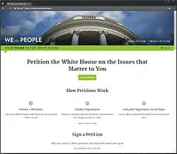 We the People, launched September 22, 2011,[1] is a defunct section of the whitehouse.gov website used for petitioning the administration's policy experts. Petitions that reached a certain threshold of signatures were reviewed by Administration officials who in most instances would subsequently provide an official response.[1] Legal proceedings in the United States were not subject to petitions, rather, the site served as a public relations mechanism for the presidential administration to provide a venue for citizens to express themselves. On August 23, 2012, the White House Director of Digital Strategy Macon Phillips released the source code for the platform.[2] The source code is available on GitHub, and lists both public domain status as a work of the United States federal government and licensing under the GPL v2.[3]