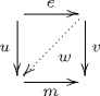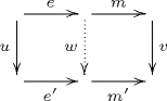 Suppose e and m are two morphisms in a category C. Then e has the left lifting property with respect to m (respectively m has the right lifting property with respect to e) when for every pair of morphisms u and v such that ve = mu there is a morphism w such that the following diagram commutes. The difference with orthogonality is that w is not necessarily unique.