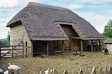 Work on re-erecting the building began on 10 April 1999, the timbers having been prepared over the previous winter.[44] The outside wall of the smoke bay was infilled with sandstone, whilst the rest of the building was infilled with wattle and daub. The roof was thatched.[45]