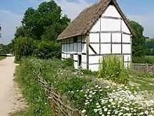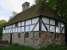 This hall house was originally built at West Lavington, West Sussex,[39] in 1609.[40] Instead of an open hall there is a central chimney with fireplaces on both ground and first floors. It retains some features from 16th-century practice, such as unglazed windows.[39] The building has a timber frame, with brick infill to the ground floor and wattle and daub infill to the first floor. It was re-erected at the museum in 1975, but the discovery of a postcard of the building at its original site showed that the chimney had not been reconstructed correctly. The chimney was rebuilt in January 2001 to a more accurate profile.[40] The house is furnished in period style.[41]