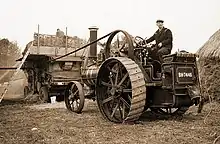 The barn was originally built at Prior's Leaze Farm, Hambrook, Sussex, somewhere around 1771.[4] It has a timber frame of oak and elm clad with weatherboards, and a roof thatched with reed. The most characteristic feature of the Hambrook barn is the aisle, which continues round the ends as well as the sides of the building. The eaves thus form a continuous line except for the high barn doors, which were needed on one side to allow loaded wagons to enter.[5] The barn houses an exhibition showing traditional building materials and building methods,[6] including displays on bricklaying, glass work, lead work, iron work, tiling and thatching.[5] During the repair of the barn, the year 1771 was found scratched on an original rafter. The date was covered by a batten from the original thatched roof and probably records the date of construction of the building.