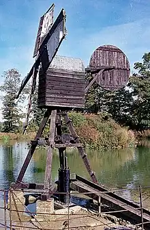 The treadwheel dates from the early 17th century. It was probably not worked by a horse due to its size. The treadwheel is housed in a small timber-framed building with a thatched roof and was originally built at Catherington, Hampshire.[53]