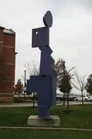 Weather Tower, a public sculpture by American artist Jerald Jacquard, is located on the Indiana University-Purdue University Indianapolis campus, which is near downtown Indianapolis, Indiana. The sculpture is located off White River Parkway East Drive in a plaza near IUPUI campus housing. Jacquard created this 20.5-foot-tall (6.2 m) painted steel sculpture in 1985. It was acquired by the Indianapolis Museum of Art in 1999, where it stood at the front entrance until de-accessioned and moved to IUPUI's campus in 2005.