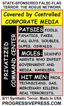 Tarpley maintains that the September 11 attacks were engineered by a rogue network of the military-industrial complex and intelligence agencies as a false-flag operation.[3][11] The common account about the events of 9/11 are in Tarpley's opinion in 2006 an "outrageous myth" and an "absurd fairy tale." The organisations involved in 9/11 apparently included Britain's MI6 as well as "government officials loyal to the invisible government."[10]