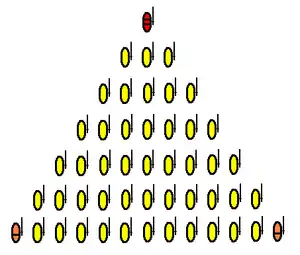 Two complete descriptions of an infantry wedge are given by Saxo Grammaticus in his Gesta Danorum. In Book I, he describes a shallow wedge, with the front rank of two men then each thereafter doubled. In Book VII, he depicts a sharper pointed formation 10 men deep with the first rank being composed of 2 men, each rank composed of 2 more.[8] Thus, each wedge was composed of 110 men, 10 deep, 2 men on its tip, and 20 on its base. According to the Vikings, the wedge formation, called by them svinfylking, cf. the Latin caput porcinum, was invented by Odin himself.[9]