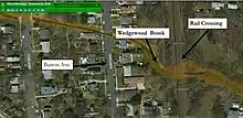 The brook arises near Woodbridge High School, flows east, and crosses Wedgewood Avenue, Amboy Avenue and Barron Avenue before entering Woodbridge River in the Woodbridge River Park. Interest in the brook has increased as it has had recurrent flooding in recent years. Woodbridge is bordered on the east by the Arthur Kill, into which the Woodbridge River flows. There is a history of tidal flooding along this river and its tributaries. Woodbridge rivers, have been described, also, as having a "high flow, flashy nature;" in addition to tidal flooding, fluvial flooding is also common. The land is relatively impervious, and flooding is exacerbated steep slopes, urban cover and outflow block. The twin culvert size at the railroad crossing just downstream from Barron Avenue is 4x4 feet; this leads to severe upstream flooding. It is estimated that a 100 year flood will put the area under nine feet of water and affect 42 homes. Farther downstream the Wedgewood Avenue neighborhood along the brook is susceptible to tidal flooding, and many of its homes have been offered buyouts by the city.[1] Frequency of flooding has increased over time. Residential areas moved into previous marsh land, decreasing the ability of the land to absorb excess water. Wedgewood Brook is the northern boundary of the area most affected from Hurricane Sandy, Watson-Cramptom. Prior to 2009 this area was zoned for high density residential housing, including the area consisting of wetlands and meadows.[2] When the Sandy came, there was a combination of tidal and fluvial flooding; it was "characterized as a tsunami-like water wall," destroying adjoining homes.[3] After Sandy, using money from the New Jersey Buyout Program,[4] Woodbridge bought out and demolished many residential properties in the flood hazard areas.[5] Woodbridge's actions and plans have been called a "slow motion evacuation from climate change." As people move out of flood hazard areas, they will replaced by a "floodplain forest of native trees, shrubs and grass."[6] In Woodbridge not everybody wants to sell; 2050, when the properties may be under water, seems too far in the future for some.[7] This interferes with the goal of land buffers, entire blocks, between rivers and homes.[8]