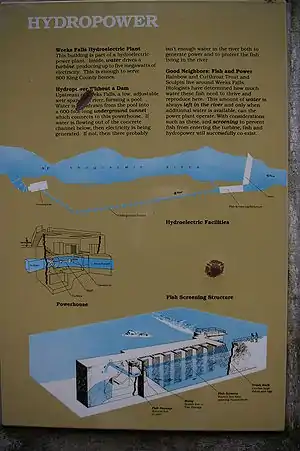 Weeks Falls has a small hydroelectric plant operated by CHI West which generates about 4.3 Megawatts peak. It is unusual because it operates without a dam. Instead, water is being drawn from the river above the falls and run down an underground channel to the generation unit at the bottom of Weeks Falls.