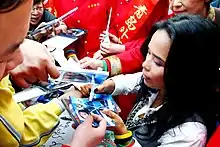 In 2012, she attended a charity auction in Beijing alongside her three children to auction the dress she wore during her performance at the 2008 Beijing Olympics. It sold for a record CNY ¥300,000 (US$42,800), and all proceeds were donated to charity.[61] In 2013, to raise funds for cancer research and to spread awareness for cancer patients, she performed Dedication of Love at the 15th Beijing Hope Run & Dash held in Chaoyang Park, Beijing to an audience of over 5585 people, for which she was awarded a world record for "the most number of people who sang Dedication of Love using sign language at the same time in the world" by the World Record Association of Hong Kong.[62]