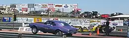 Chevrolet Camaro performing a wheelie during drag racing.