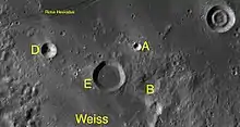 By convention these features are identified on lunar maps by placing the letter on the side of the crater midpoint that is closest to Weiss.