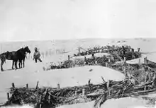 On 21 August the regiment moved back to "Big Table Top" for the pending assault on Hill 60. The attack, at 15:30, succeeded in capturing around two hundred yards (180 m) of Turkish trenches. Two days later, at 17:15, the regiment was relieved and rejoined the brigade at Kabak Kuyu, but at 19:30, five officers and 125 other ranks had to return to the front to defend the western slopes of Hill 60. The same day, three officers and seventy-seven other ranks arrived as reinforcements for the regiment.[39] On 25 August those men still at the front were relieved by the Canterbury Mounted Rifles and Otago Mounted Rifles, in preparation for a night assault on Hill 60 by the brigade. The assault was postponed for two days to rest the men. Although the brigade was responsible for the centre objective during the assault, it could only provide three hundred men, with another one hundred men coming from the Australian 18th Battalion. The regiment's contribution was five officers and 125 other ranks. The battle commenced with an hour-long artillery bombardment. The Auckland and Canterbury Mounted Rifles formed the first line of attack, the Wellington regiment and the Otago Mounted Rifles the second, and the Australians made up the third line. At 17:00 the attack began, and despite taking heavy casualties crossing no man's land, the first Turkish line was captured. The Wellington regiment and Otago Mounted Rifles continued on, took out a machine-gun post and captured the second Turkish trench, but sustained heavy casualties.[36][40][41] On the other flanks the supporting assaults had failed, leaving the regiment and the Otago Mounted Rifles isolated on a narrow front. The brigade therefore consolidated the ground already captured and moved forward their machine-guns to support the defence; the forward defensive line was only forty men. The regiment's casualties during the battle were fifty dead and fifty-nine wounded.[42] That night the remainder of the regiment moved into the front line. They fought off several counter-attacks, losing another man killed and eleven wounded.[43] On 29 August the regiment was relieved by the 163rd (Norfolk & Suffolk) Brigade, but remained in the reserve trenches for the next three days. Even there the number of casualties continued to increase, so that by 2 September there were only six officers and ninety-nine men left in the regiment. Despite this, they still had to supply five officers and thirty-nine other ranks to occupy a trench on "Cheshire Ridge".[44]
