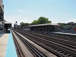 Wellington station opened in 1900 as a local station on the original Northwestern Elevated Railroad route from Lake and Wells in downtown to Wilson Station.[2] From the late 1940s Wellington became a station on the Ravenswood route (now the Brown Line). The original station house was demolished in the 1960s following a fire. Purple Line express trains began stopping at the station in 1998 as part of an effort to help alleviate congestion on the Brown Line.[3]