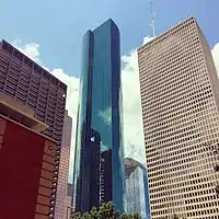 It was designed by Richard Keating, FAIA, while a partner of Skidmore, Owings & Merrill.[5] In 1983, the building lost a large number of windows during Hurricane Alicia.[6] Originally named the Allied Bank Plaza, it was renamed to the First Interstate Bank Plaza in 1988.[7] First Interstate Bancorp was then taken over in 1996 by Wells Fargo, therefore transferring ownership of the building.
