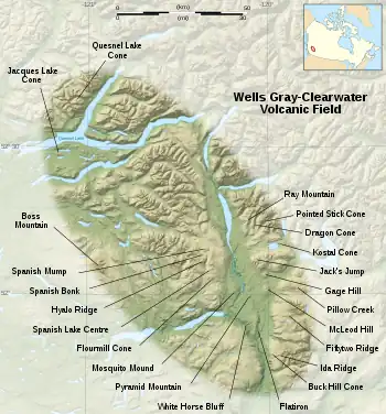 The Wells Gray-Clearwater volcanic field, also called the Clearwater Cone Group,[2] is a potentially active[3] monogenetic volcanic field in east-central British Columbia, Canada, located approximately 130 km (81 mi) north of Kamloops. It is situated in the Cariboo Mountains of the Columbia Mountains and on the Quesnel and Shuswap Highlands. As a monogenetic volcanic field, it is a place with numerous small basaltic volcanoes and extensive lava flows.[4][5]