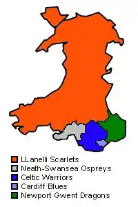 At a meeting held between the WRU and the eight Premier League clubs on 5 December 2002, Terry Cobner, the WRU director of rugby, and David Moffett outlined plans for a regional system similar to that used by the Irish Rugby Football Union. The only proposal offered to the clubs was for four regional sides, all of which would be under the control of the Welsh Rugby Union with the existing clubs acting as feeder clubs providing their best players to the regions.[13] The locations of the four regions, and the proposed feeder clubs were as follows: