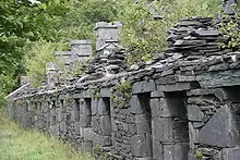 There were several different categories of worker in the quarries. The quarrymen proper, who made up just over 50% of the workforce, worked the slate in partnerships of three, four, six or eight, known as "bargain gangs".[48] A gang of four typically consisted of two "rockmen" who would blast the rock to produce blocks, a splitter, who would split the blocks with hammer and chisel, and a dresser. A rybelwr would usually be a boy learning his trade, who would wander around the galleries offering assistance to the gangs. Sometimes a gang would give him a block of slate to split. Other groups were the "bad rockmen" who usually worked in crews of three, removing unworkable rock from the face, and the "rubbish men" who cleared the waste rock from the galleries and built the tips of waste which surrounded the quarry.[49] Only about a tenth, or less, of the rock extracted became finished product.[50]