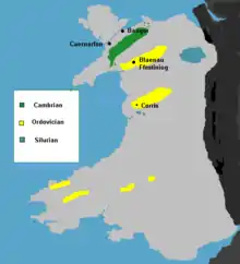 The slate deposits of Wales belong to three geological series: Cambrian, Ordovician and Silurian. The Cambrian deposits run south-west from Conwy to near Criccieth; these deposits were quarried in the Penrhyn and Dinorwig quarries and in the Nantlle Valley. There are smaller outcrops elsewhere, for example on Anglesey. The Ordovician deposits run south-west from Betws-y-Coed to Porthmadog; these were the deposits mined at Blaenau Ffestiniog. There is another band of Ordovician slate further south, running from Llangynnog to Aberdyfi, quarried mainly in the Corris area, with a few outcrops in south-west Wales, notably Pembrokeshire. The Silurian deposits are mainly further east in the Dee valley and around Machynlleth.[7]