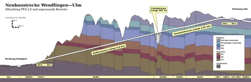 - Section 2.2 (Albaufstieg: Alb ascent) consists mainly of the approximately 8.8 km for the Bossler tunnel, two approximately 480 m-long bridges over the Fils valley and the approximately 4.8 km-long Steinbühl tunnel.