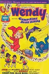 Wendy was introduced as a back-up feature as well as a companion for Casper in Casper the Friendly Ghost #20, May 1954. Casper met and befriended her after stopping a major battle between the witches and ghosts. Soon, she was trialed in Harvey Hits, starting with #7. After a total of six appearances, she received her own title, Wendy the Good Little Witch, in August 1960.[1] Other ancillary titles featuring the pleasant young witch include Wendy Witch World (October 1961 to September 1974), and Casper and Wendy (September 1972 to November 1973). Another Wendy the Good Little Witch comic ran from April 1991 to August 1994, and a three-issue Wendy the Good Little Witch and New Kids on the Block saw print in 1991.