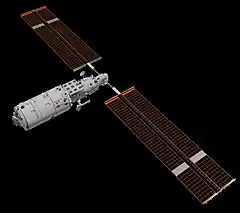 Electrical power is provided by two steerable solar power arrays, which use photovoltaic cells to convert sunlight into electricity. With a wingspan of over 55 m (180 ft), each array has an energy collection area of 110 m2 (1184 square ft).[12] The energy is then stored to power the station when it passes into the Earth's shadow. Resupply ships will replenish fuel for LCM 1 for station-keeping, to counter the effects of atmospheric drag.