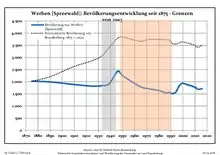 Development of Population since 1875 within the Current Boundaries (Blue Line: Population; Dotted Line: Comparison to Population Development of Brandenburg state; Grey Background: Time of Nazi rule; Red Background: Time of Communist rule)