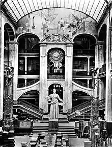 With the construction of the corner pavilion on the Leipziger Platz frontage, with its deep portico, in 1904, Messel created nothing less than the incunabulum of progressive department store architecture. The traditional formal language, with the quasi-ecclesiastical sculpture employed, was described by critics as a "positive catastrophe", contrasting with the much-derided Berliner Dom (Cathedral), which was completed around the same time.[2] The portico's sculptures, featuring figures from the Old Testament and Greek Mythology were the work of Josef Rauch (1868-1921).[3] Fritz Stahl made the comment that the Leipzigerplatz portico was the "first building of the time to restore sculpture to its true architectonic relationship".[4]