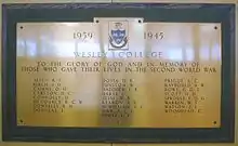 Wesley, like many other schools in Ireland, contributed to the effort of the two major world wars. Over 85 students of the college died in the First World War. Their names are listed on a memorial in the college concourse which reads "This building was erected to the honour of all old boys of this College who ventured their lives for defence of home and country in the Great War and especially in loving and grateful memory of those who fell". (The building mentioned was the old College Chapel, where the memorial was located before the move to Ballinteer.) 25 students of Wesley, including one German, died between 1939 and 1945 in the Second World War. These are also listed on a memorial in the main concourse. Remembrance Day is marked each year with the laying of a wreath on the memorial.