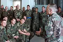 His Officer Evaluation Report (OER) for his command at Fort Hood called him "one of the Army's best and brightest".[42] Clark was awarded the Distinguished Service Medal for his work at Fort Hood and was promoted to lieutenant general at the end of his command in 1994. Clark's next assignment was an appointment as the Director, Strategic Plans and Policy (J5), on the staff of the Joint Chiefs of Staff (JCS), from April 1994 to June 1996.[30][43] In this position, he helped develop and coordinate world-wide US military policy and strategy. He participated with Richard Holbrooke in the Dayton Peace Process, which ended the Bosnian war in former Yugoslavia. During this period, he also participated in "back-stopping" nuclear negotiations in Korea, planning the restoration of democracy in Haiti, shifting the United States Southern Command headquarters from Panama to Miami, imposing tougher restrictions on Saddam Hussein, rewriting the National Military Strategy, and developing Joint Vision 2010 for future US war-fighting.[44]