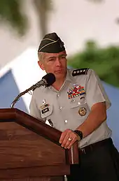 Army regulations set a so-called "ticking clock" upon promotion to a three-star general, essentially requiring that Clark be promoted to another post within two years from his initial promotion or retire.[45] This deadline ended in 1996 and Clark said he was not optimistic about receiving such a promotion because rumors at the time suggested General Dennis Reimer did not want to recommend him for promotion although "no specific reason was given".[46] According to Clark's book, General Robert Scales said that it was likely Clark's reputation for intelligence was responsible for feelings of resentment from other generals. Clark was named to the United States Southern Command (USSOUTHCOM) post despite these rumors. Congress approved his promotion to full general in June 1996, and General John M. Shalikashvili signed the order. Clark said he was not the original nominee, but the first officer chosen "hadn't been accepted for some reason".[46][47]
