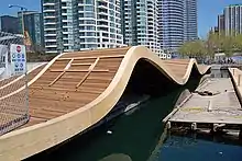 Undulating wave shapes are also part of West 8's designs, with DTAH, for a series of wavedecks on Toronto's waterfront. The wooden-planked walkways are part of a redevelopment project overseen by Waterfront Toronto. The first three of the four planned wavedecks (Rees wavedeck, Spadina wavedeck, and Simcoe wavedeck) have been completed.