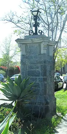 Stone marker placed by West Adams Heights tract realtors at Washington Boulevard.
