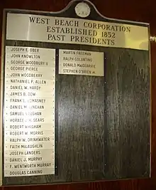 West Beach's governing organization has been incorporated since April 21, 1852 [1] by the Massachusetts State House of Representatives. The beach and surrounding land was originally deeded to John West in 1666.[1] Mr. West bequeathed the land to the residents of Beverly Farms and Prides Crossing. Section 3 of the West Beach Corporation by-laws describes the intended use of the beach for: "The members of said corporation may use and occupy said described portions of sea shore, beach and flats for the purpose of gathering drift-stuff and sea weed, and of boating and bathing, as the said premises have heretofore been used and occupied by them and predecessors; and also providing facilities for the enjoyment and beautification of the beach and shore by members; by providing swimming classes for members and their guests; to give courses in safety in the water and small boat handling...."[1] West Beach has a historic past. It is the site for the annual Farms-Prides Fourth of July fireworks display that has occurred for over 100 years. Noted Author, John Updike, who resided locally was a frequent visitor. Nineteenth-century author Nathaniel Hawthorne from the nearby city of Salem, Massachusetts visited West Beach as noted by his son.[2] Artist Fitz Henry Lane painted a landscape of the beach in the mid-19th century that sold for $3.85 million at an art auction in 1997. [3]